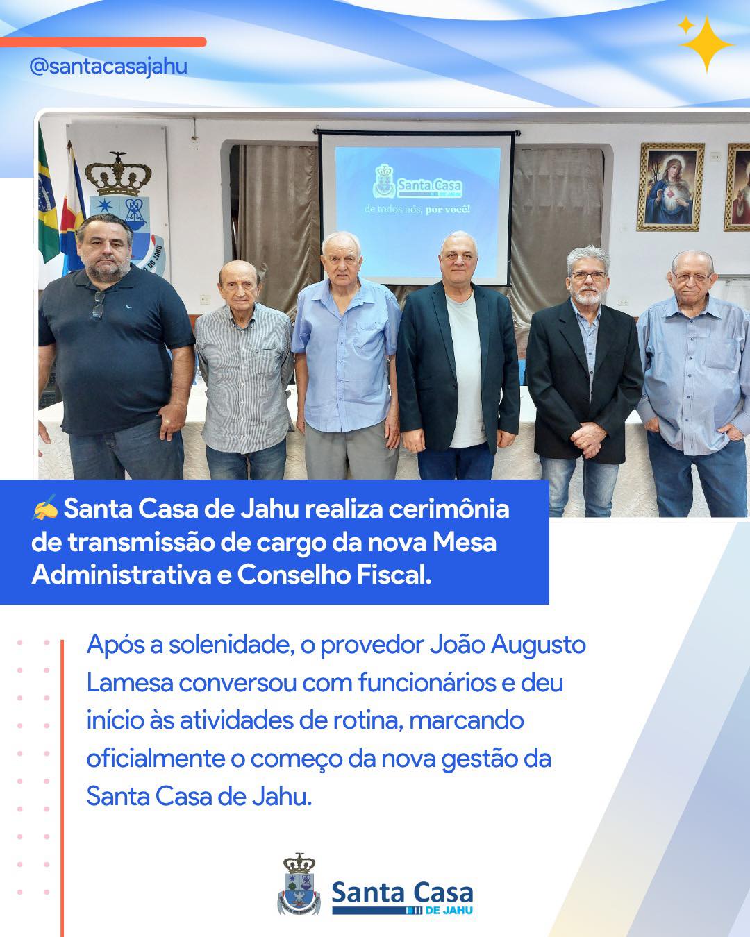 🏥 A Irmandade de Misericórdia do Jahu realizou na manhã desta quarta-feira, 1º de outubro, a cerimônia interna de transmissão de cargo da nova mesa administrativa e do conselho fiscal da Santa Casa de Jahu. Os eleitos no dia 25 de setembro assumem mandato até 30 de abril de 2026.