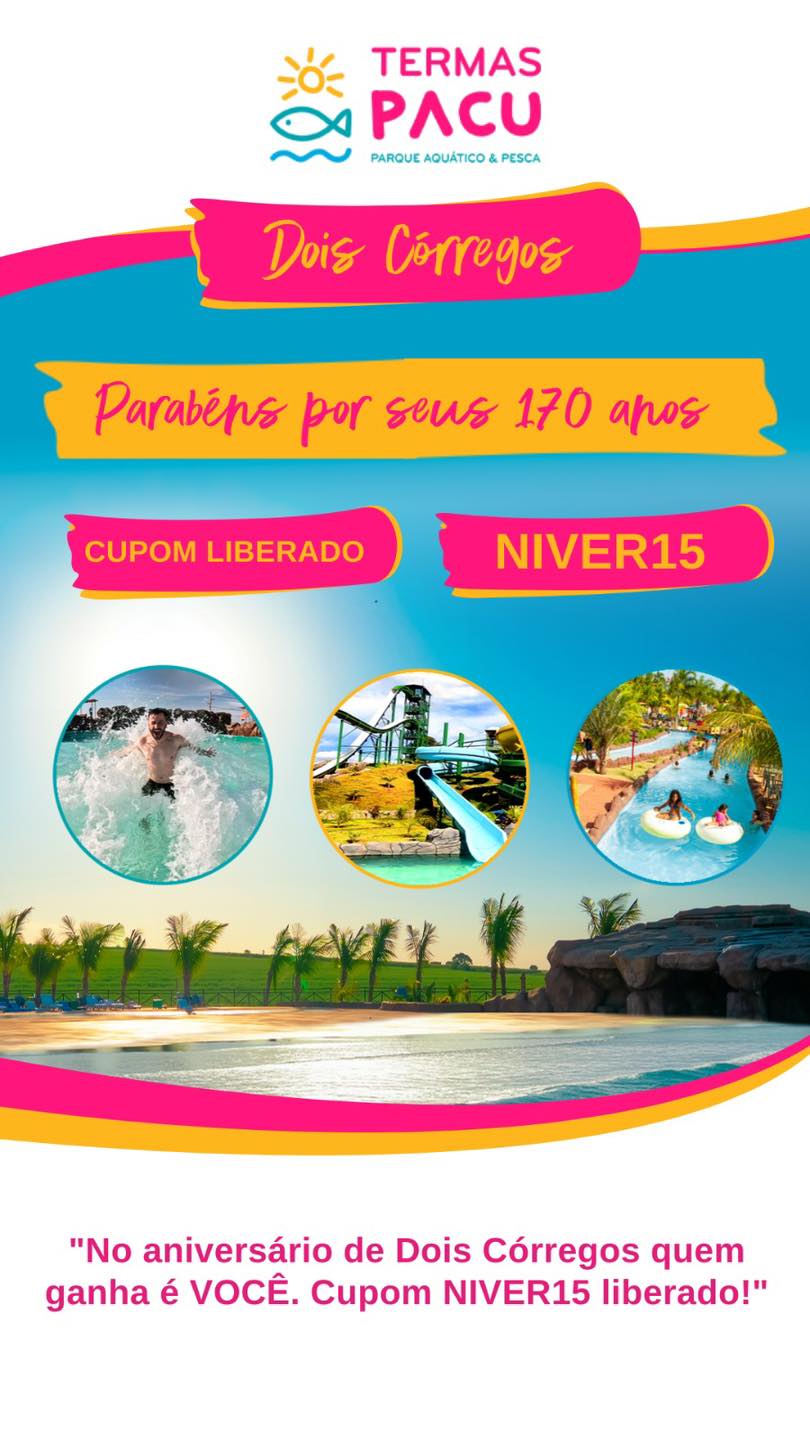 Use o cupom NIVER15 e venha viver um dia espetacular com a gente no Termas Pacu 💦☀️