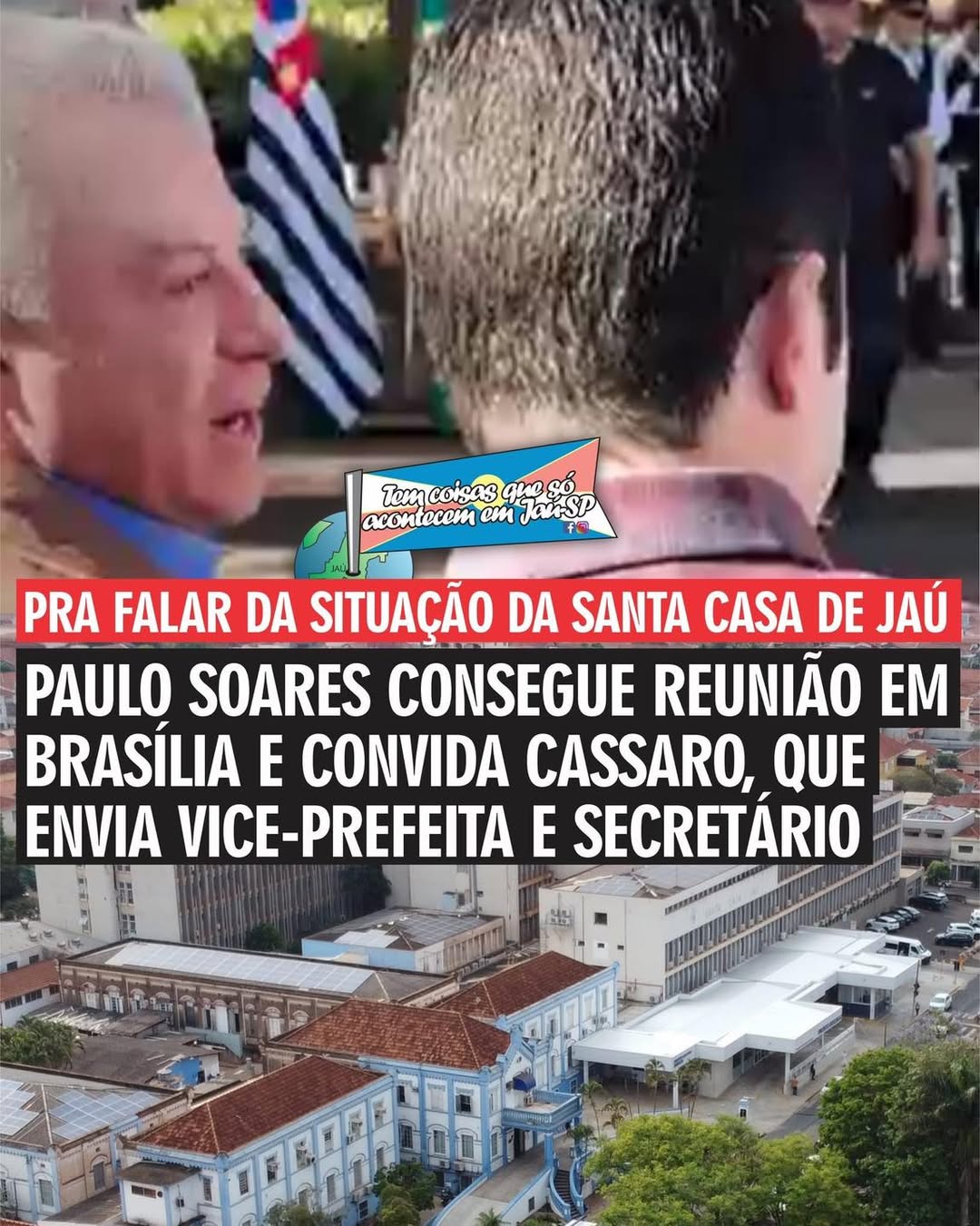 PAULO SOARES CONSEGUE REUNIÃO EM BRASÍLIA E CONVIDA CASSARO PARA PARTICIPAR, que envia vice-prefeita e secretário da saúde para representá-lo. Numa atitude quase inédita, adversários na última eleição se unem em prol de um bem comum: buscar solução para a situação da Santa Casa de Jaú. O apresentador Paulo Soares articulou, através da deputada Renata Abreu, uma reunião para esta quarta-feira (17.set) com o Ministro da Saúde, Alexandre Padilha, e com o vice-presidente da República, Geraldo Alckmin, a fim de tratar do futuro do hospital de Jaú. Ele estendeu o convite ao prefeito Ivan Cassaro, que enviou duas pessoas para representar o município. Também estará presente Scila Carretero, representando a direção da Santa Casa. Agora, resta aguardar os resultados que essa reunião poderá trazer para o hospital.