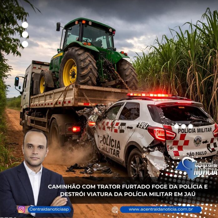 Uma perseguição policial terminou com uma viatura da Polícia Militar destruída em Jaú após ser atingida por um caminhão que transportava um trator furtado. A ocorrência mobilizou equipes da região durante a madrugada e terminou com danos na viatura e um policial ferido.