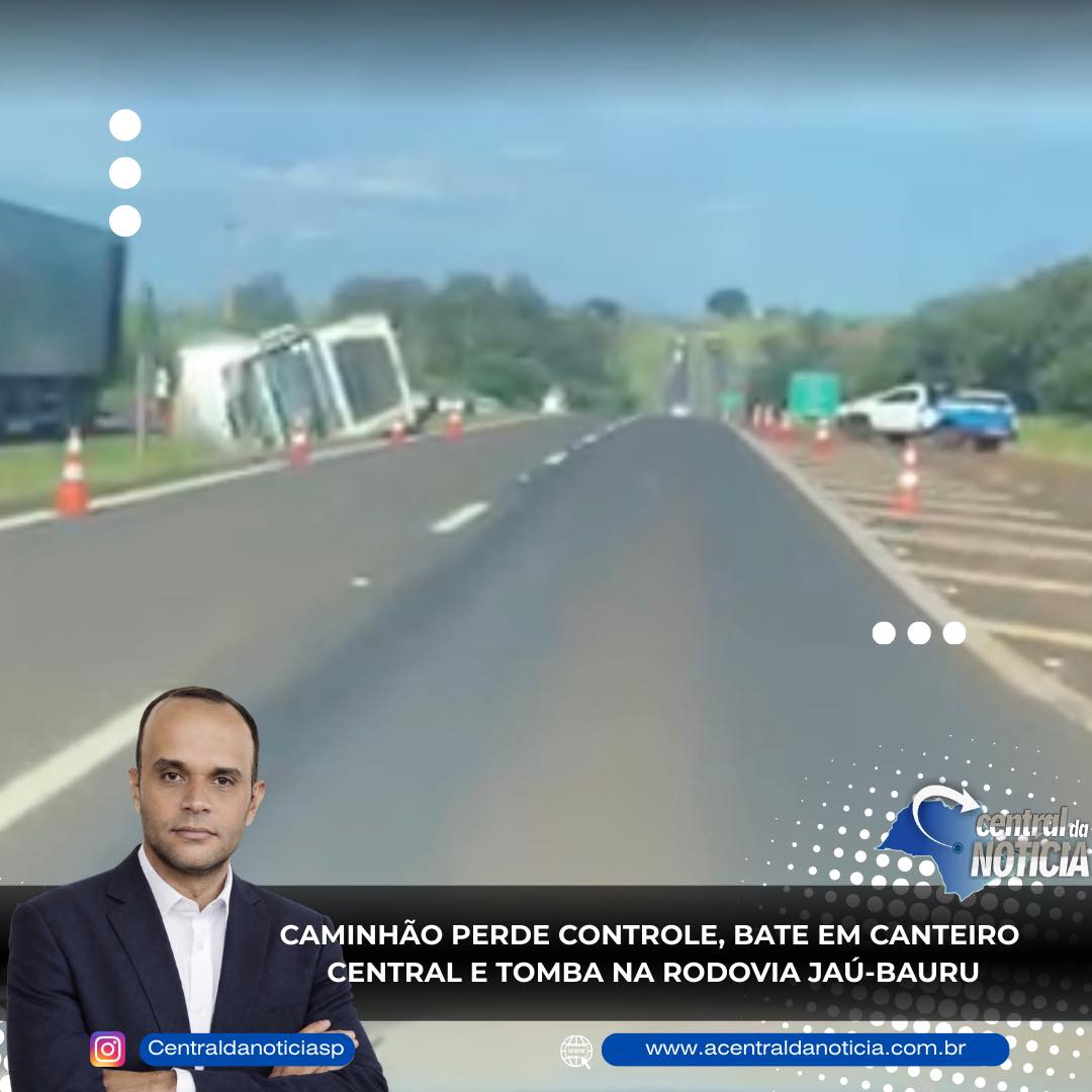 Caminhão perde controle, bate em canteiro central e tomba na rodovia Jaú-Bauru