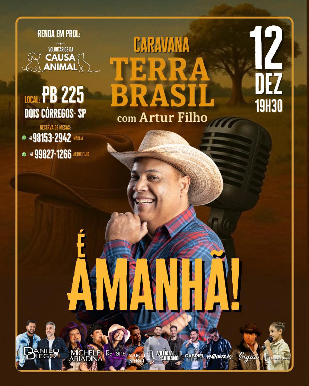 Uma noite de música, alegria e solidariedade promete movimentar a região nesta sexta-feira (12), a partir das 19h30, com a realização da Caravana Terra Brasil. O evento, comandado pelo locutor e apresentador Artur Filho, traz para o público uma programação especial com talentos da música sertaneja e clima de grande festa.