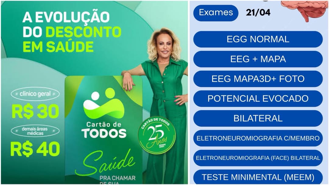 Na rede conveniada, como a Clínica Amor e Saúde, os serviços seguem ampliados, incluindo consultas e exames neurológicos especializados. Entre os procedimentos disponíveis estão EEG normal, EEG com mapeamento, EEG 3D com foto, potencial evocado, exames bilaterais, eletroneuromiografia de membros e face, além do teste cognitivo (MEEM).