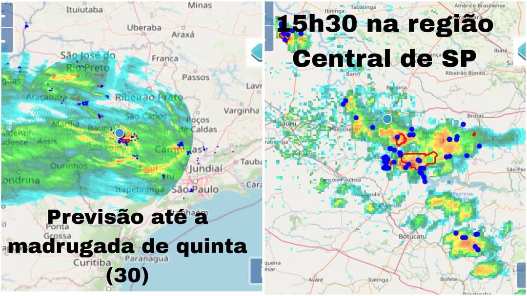 Os radares do Instituto de Pesquisas Meteorológicas (IPMet) mostram diversas nuvens de chuva se aproximando da região central do estado de São Paulo. Também há registros de chuva nas partes extremas do estado, como a região de Araçatuba, e ainda na capital e no litoral.