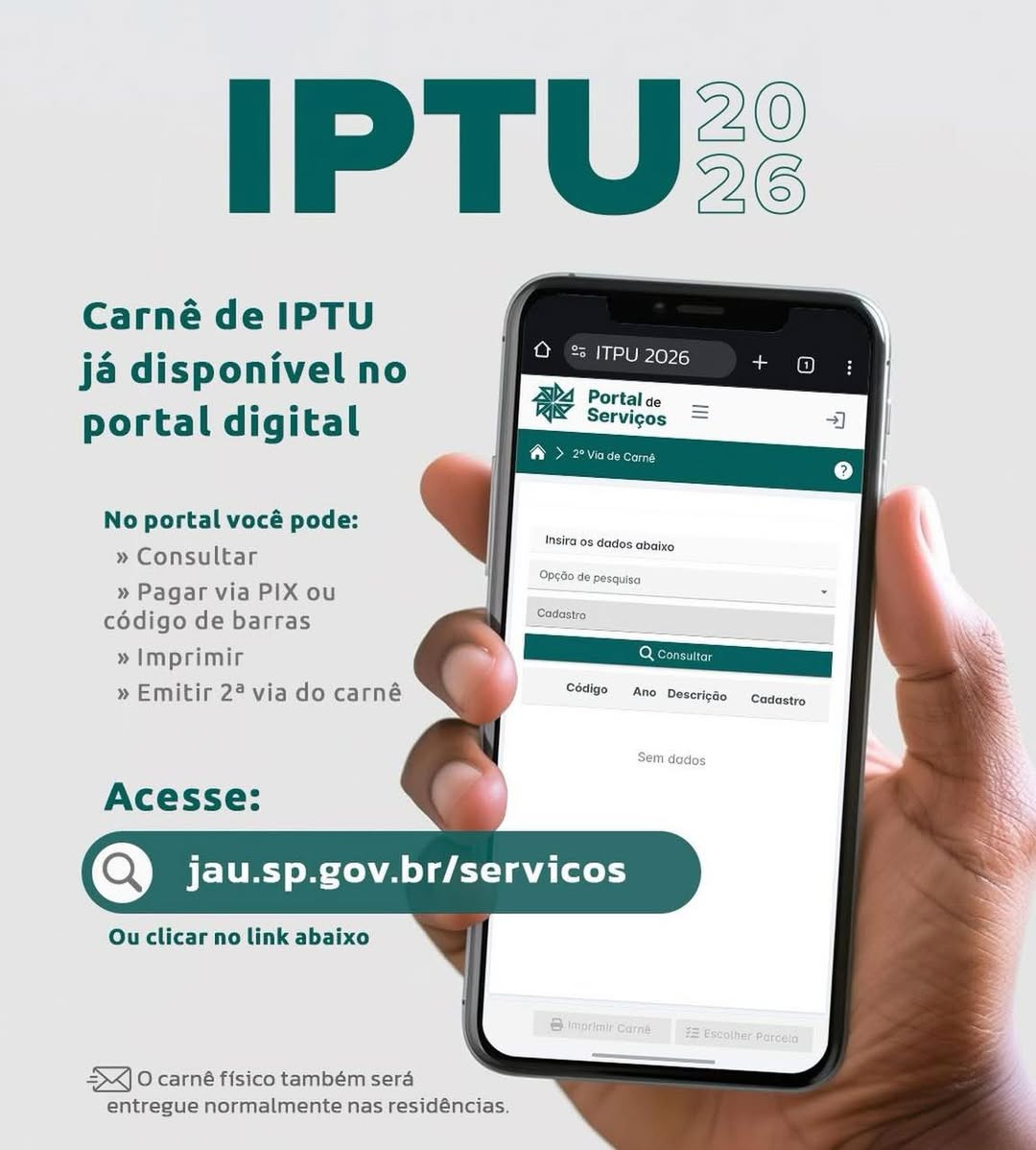 Acessar o documento é simples. Basta clicar no link https://jau.portalservicos.app.br:2053/carne?menu=2 e preencher os dados solicitados.