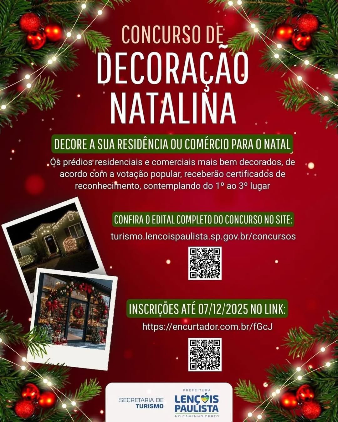 A iniciativa acontece em Lençóis Paulista e Região, com inscrições abertas até 7 de dezembro por meio de formulário eletrônico no site da Secretaria. A proposta é valorizar o visual das ruas, fortalecer o espírito de Natal e estimular o turismo no período festivo.