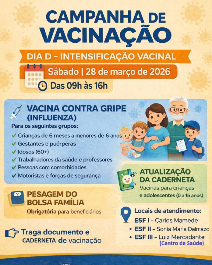 A Saúde promove neste sábado, 28 de março, uma grande mobilização de saúde com o Dia D de Intensificação Vacinal. A ação acontece das 9h às 16h e tem como foco ampliar a cobertura vacinal, especialmente contra a gripe (Influenza), além de oferecer outros atendimentos importantes à população.