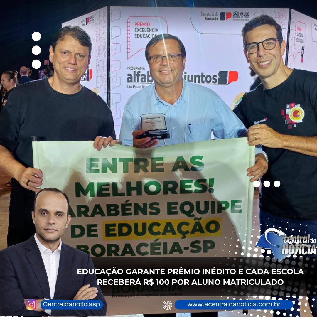 Educação garante prêmio inédito e cada escola receberá R$ 100 por aluno matriculado A educação municipal conquistou um resultado histórico e vai garantir investimento direto nas escolas: cada unidade receberá R$ 100 por aluno matriculado, fortalecendo ainda mais a qualidade do ensino e ampliando ações pedagógicas. O avanço foi alcançado com a conquista do Prêmio Excelência Educacional no município de Boracéia. O reconhecimento veio nesta terça-feira, 17 de março, durante cerimônia realizada no Memorial da América Latina, em São Paulo. A conquista faz parte do Programa Alfabetiza Juntos SP e destaca o avanço na alfabetização das crianças na idade certa. O prêmio é baseado nos resultados do SARESP, que avalia o rendimento escolar, principalmente a fluência na leitura e o desempenho nos primeiros anos do Ensino Fundamental. Dinheiro direto para as escolas Cada escola da rede municipal será beneficiada com o repasse proporcional ao número de alunos matriculados. O recurso deverá ser utilizado em melhorias estruturais, projetos pedagógicos e ações que fortaleçam ainda mais a qualidade do ensino. Reconhecimento inédito Essa é a primeira vez que Boracéia conquista o prêmio, consolidando um avanço significativo na educação pública do município. O gestor Marcos Bilancieri destacou que o resultado é fruto de um trabalho coletivo e de metas bem definidas após quase conquistar o prêmio no ano anterior. Trabalho em equipe fez a diferença A diretora de Educação, Aparecida Andréa Herreira, reforçou que o reconhecimento só foi possível graças ao empenho de professores, diretores e equipes escolares. Segundo ela, estratégias eficazes foram fundamentais para melhorar a alfabetização e garantir o desempenho que levou à premiação. A conquista agora reforça o compromisso de manter a qualidade do ensino e seguir avançando nos índices educacionais da cidade.