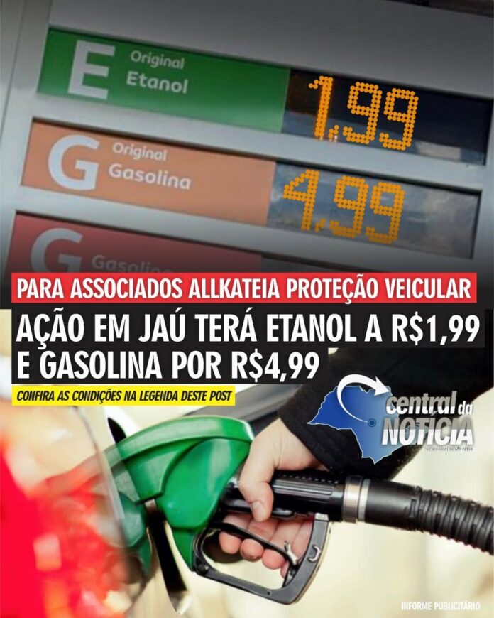 ETANOL A R$1,99 E GASOLINA POR R$ 4,99 EM JAÚ; Allkateia vai disponibilizar combustível mais barato a associados nesta sexta-feira (27/fev), das 17h30 às 20h30, para pagamentos via PIX ou dinheiro.