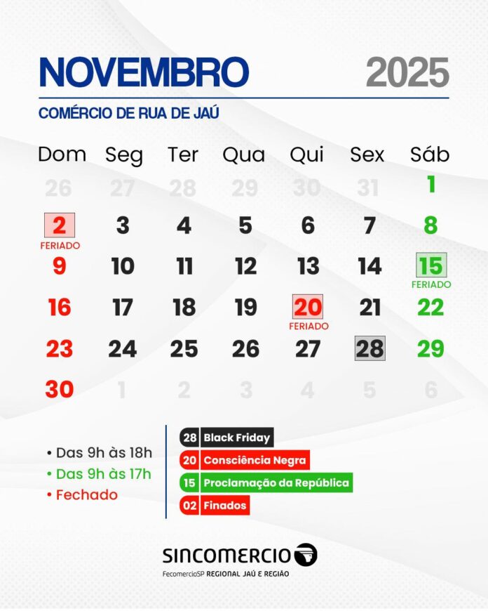 🗓 CONFIRA O CALENDÁRIO DE NOVEMBRO 2025 – COMÉRCIO DE RUA DE JAÚ