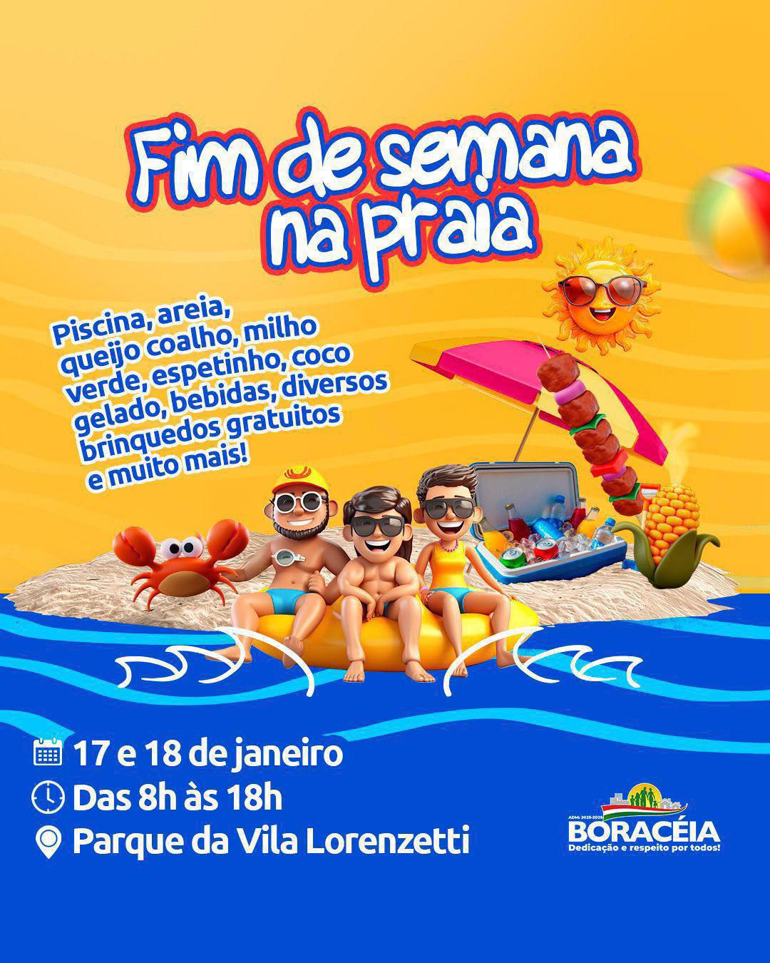 Além da estrutura de praia, o local contará com diversos brinquedos infláveis e brincadeiras ao longo dos dois dias, garantindo diversão para todas as idades. A expectativa é de dias ensolarados para completar o clima de verão e lazer.