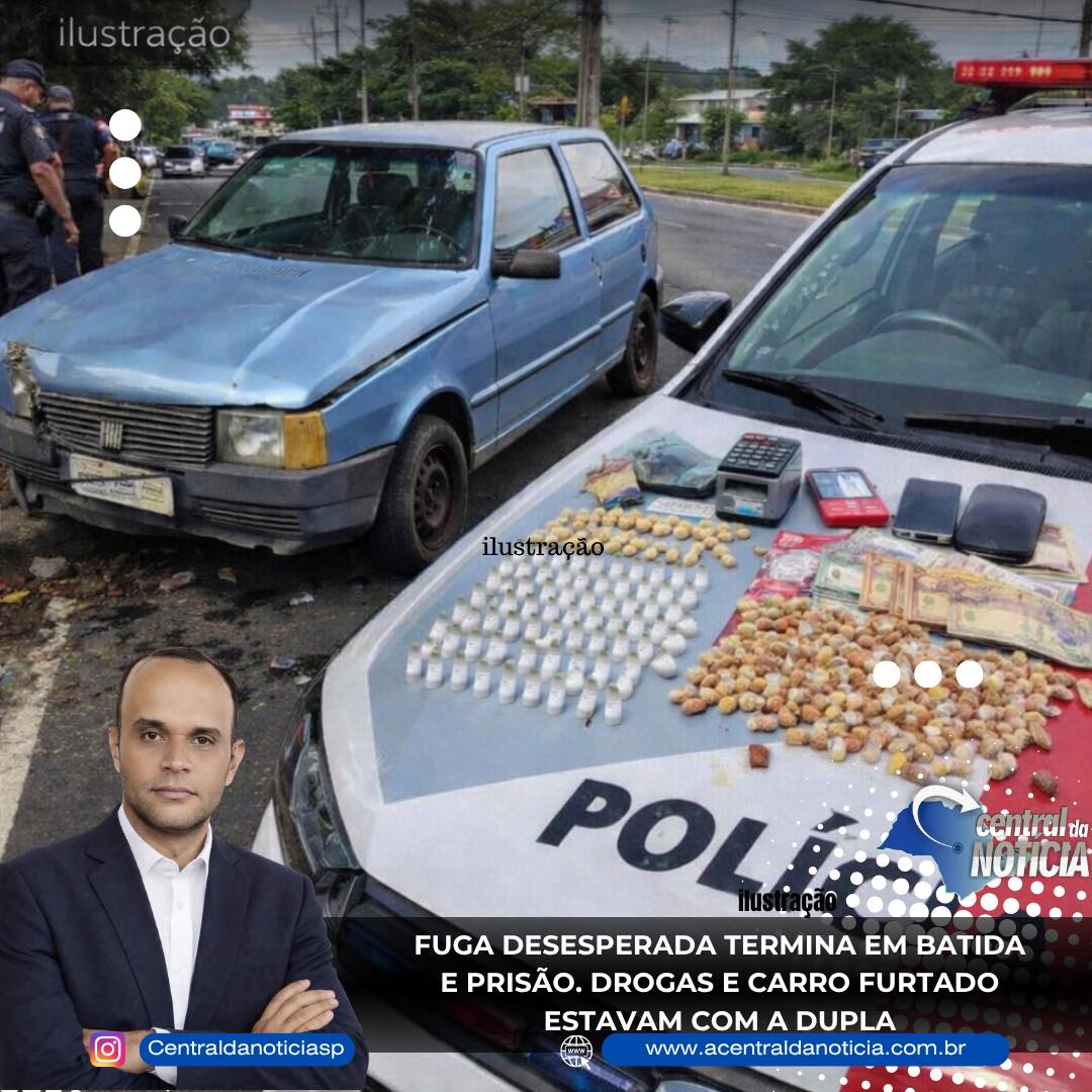 Fuga desesperada termina em batida e prisão. Drogas e carro furtado estavam com a dupla