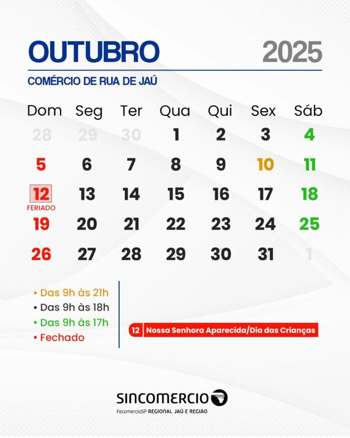 O Sincomercio JAU divulgou o calendário de funcionamento do comércio de rua para o mês de outubro de 2025. Confira como ficam os horários: