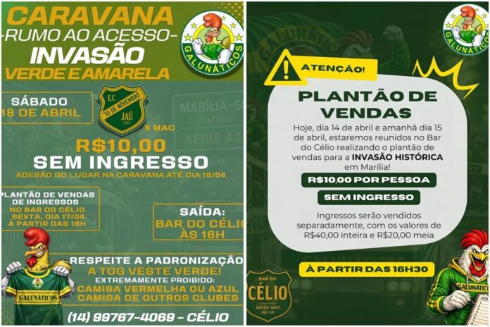 Em Jaú, a mobilização é grande e promete marcar história. A tradicional torcida organizada Galunáticos prepara uma verdadeira invasão verde e amarela rumo a Marília, mostrando mais uma vez a força e a fidelidade de quem acompanha o time onde ele estiver.