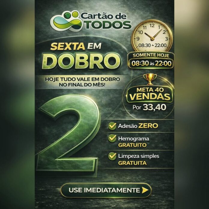 Somente nesta sexta-feira, o CARTÃO DE TODOS promove uma ação especial e limitada: as 40 primeiras pessoas que se filiarem garantem benefícios exclusivos na hora. A campanha “Sexta em Dobro” reforça ainda mais as vantagens para novos associados, com condições diferenciadas válidas apenas durante o dia.