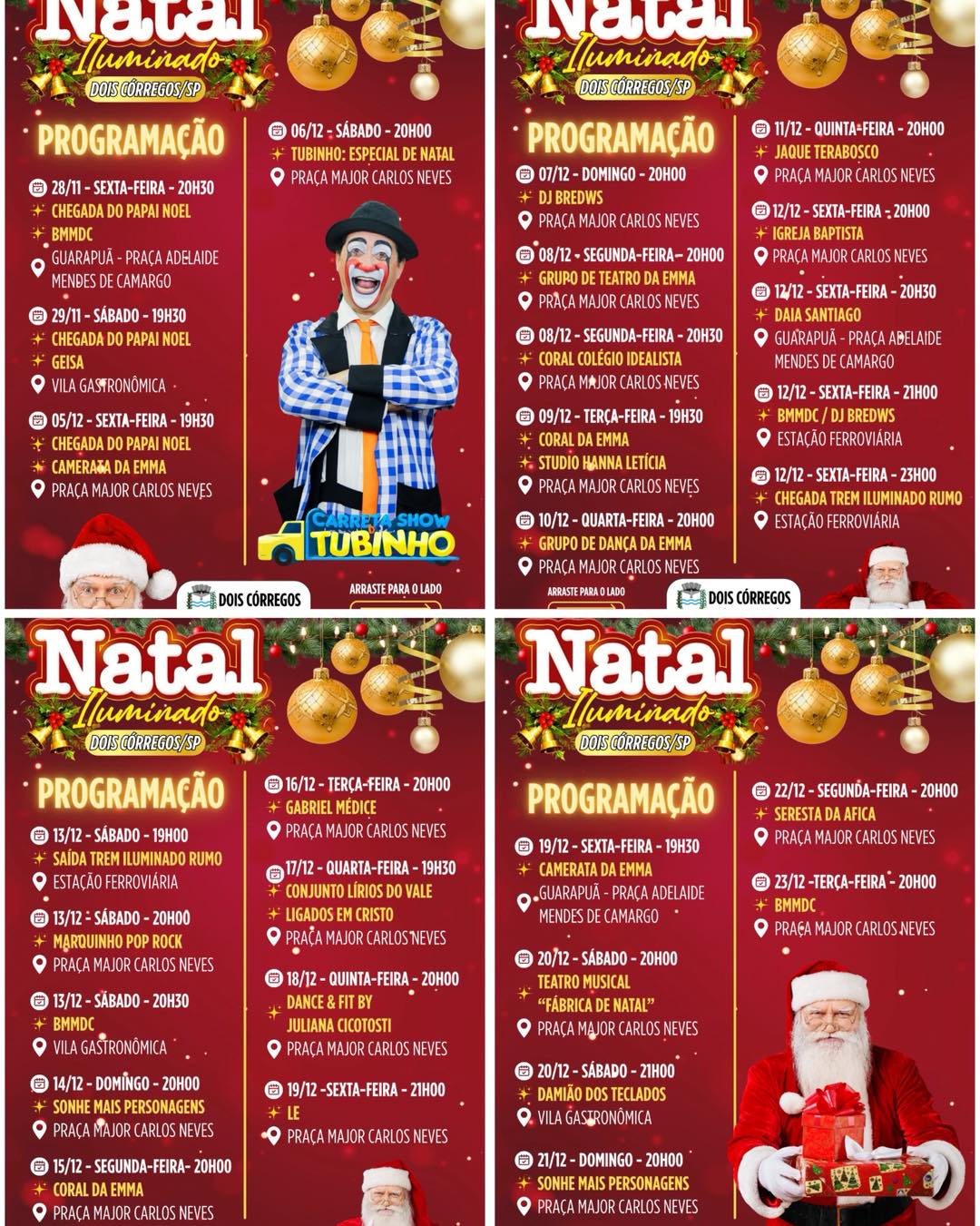 As festividades de Dois Córregoscomeçam com força total no fim de novembro e seguem até o fim de dezembro, com destaque para três momentos muito esperados: a chegada do Bom Velhinho em Guarapuã no dia 28, a segunda recepção na Vila Gastronômica no dia 29 e os animados shows do Tubinho, que sempre reúnem público de todas as idades.