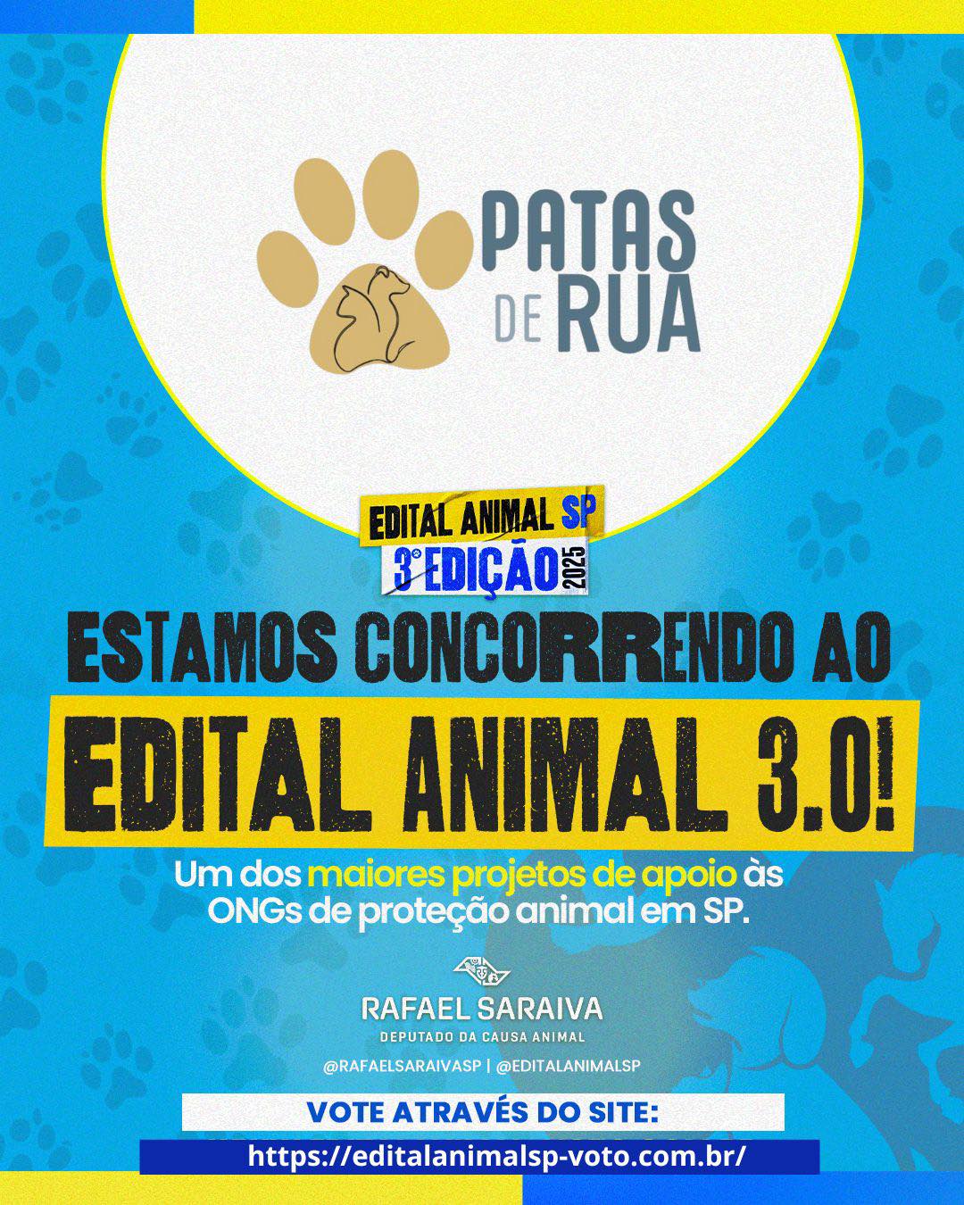 A luta diária em defesa dos animais pode render um importante reforço para quem transforma compaixão em ação. A ONG Patas de Rua está concorrendo ao Edital Animal 3.0, programa criado por um representante do povo no Estado que destina recursos financeiros a organizações com boas referências no cuidado, acolhimento e proteção dos animais.