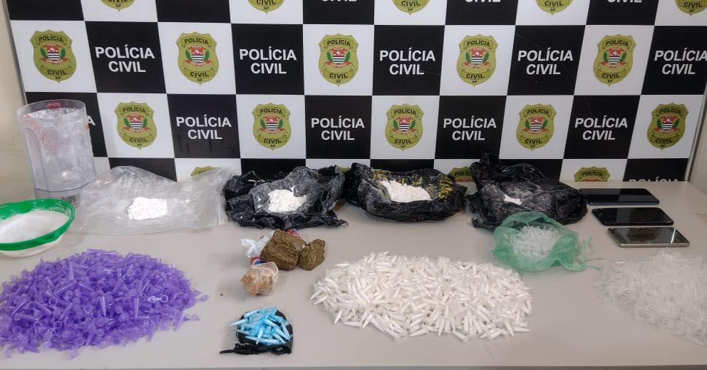 As drogas e os objetos foram recolhidos e encaminhados à delegacia para as providências legais.