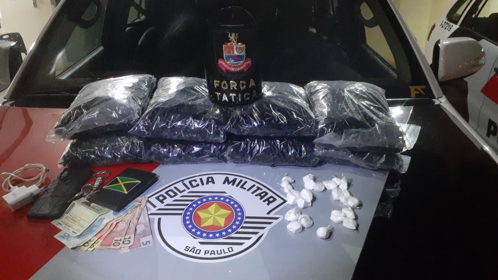 Em busca pessoal, os militares encontraram duas porções de cocaína e um molho de chaves nas mãos do indivíduo. No imóvel foram localizadas mais porções de cocaína (totalizando 22 porções), um celular que estava carregando, uma carteira com documentos pessoais do homem e uma caixa de papelão com cerca de 8 mil pinos vazios.