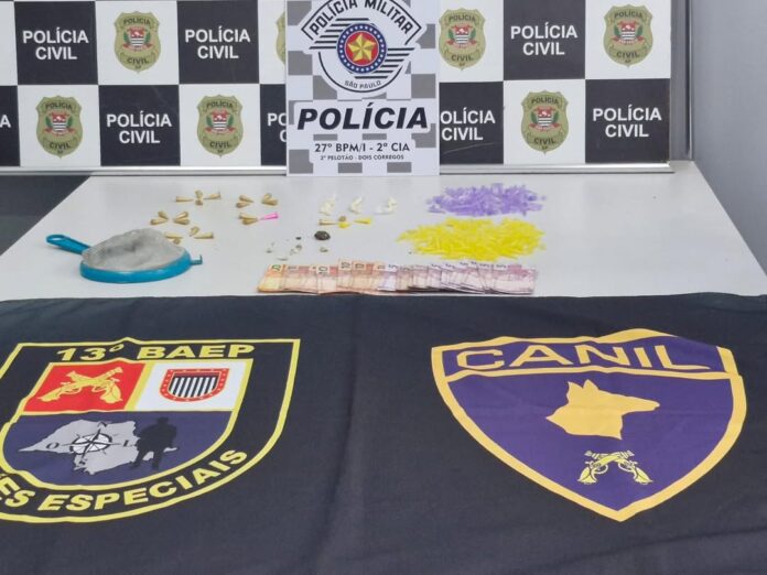 O flagrante aconteceu na Vila São Pedro, em Dois Córregos, após os policiais constatarem intensa movimentação na residência. Durante a abordagem, um dos adolescentes tentou fugir pelos fundos, mas foi detido na rua de trás com porções de crack, cocaína e dinheiro. O outro foi surpreendido dentro do imóvel, onde, com auxílio de um cão farejador, foram encontradas diversas porções de cocaína, maconha e crack, além de materiais usados para o preparo e embalagem da droga.