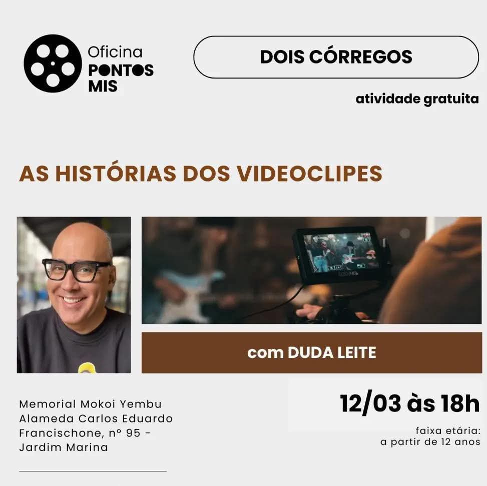 Quem gosta de música, audiovisual e criatividade tem um encontro marcado com o universo dos videoclipes. A oficina “As Histórias dos Videoclipes”, com o artista e pesquisador Duda Leite, promete um bate-papo envolvente sobre criação, narrativa e os bastidores desse formato que marcou gerações e continua influenciando a cultura pop.